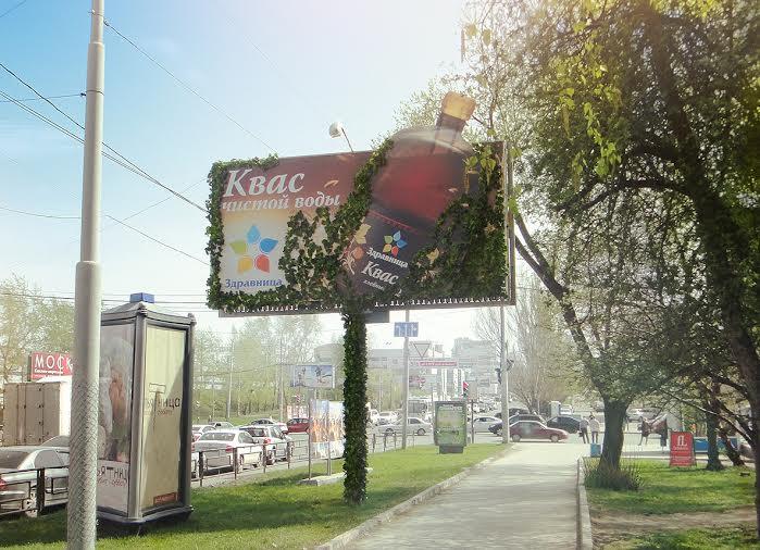 Таким способом РА «Космос» решило продемонстрировать основное преимущество продукта – натуральный квас «Здраница» создан на основе чистейшей артезианской воды, а где есть вода – обязательно появляется новая жизнь. Зеленый билборд пришелся по вкусу горожанам и привлек дополнительное внимание к рекламе кваса 'Здравница'.