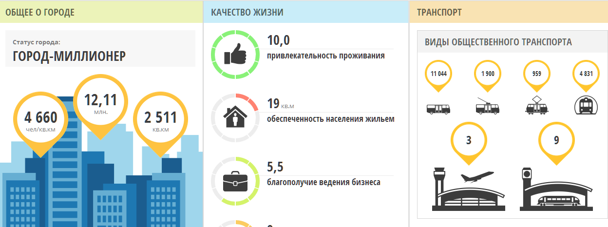 Отличие этого сервиса от конкурентов в том, что информация представлена в максимально дружелюбном к пользователю виде без потери объективности*. Показатели иллюстрируются лаконичными инфографиками, схемами и индексами. Каждый посетитель сайта может составить индивидуальную картину и сценарии изучения городов России.