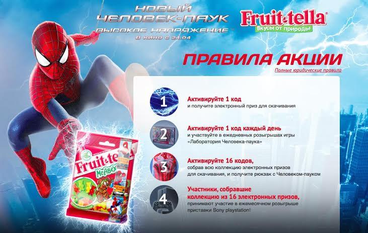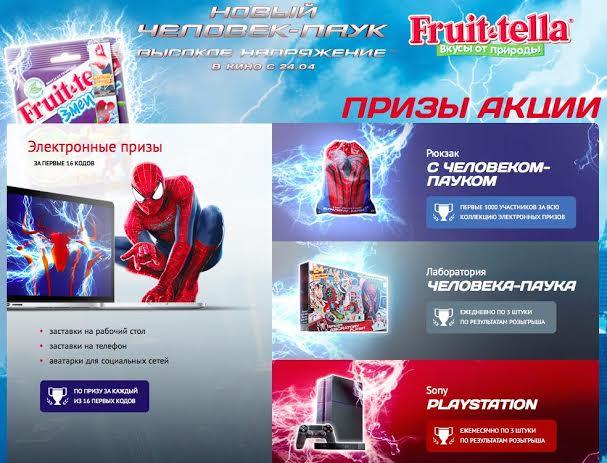 Медийное агентство Vizeum и полносервисное агентство цифровых коммуникаций Adwatch Isobar запустили масштабную промокампанию «Fruit-tella заряжает энергией!», приуроченную к выходу фильма «Новый Человек-Паук: Высокое напряжение». В основе кампании лежит промосайт с простой механикой активации кодов, которые находятся внутри пачек. Яркие промо-ленты на пачках натурального жевательного мармелада Fruit-tella приглашают поучаствовать в конкурсе.