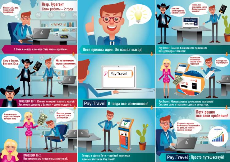 В новой стилистике были созданы видеоролик компании, клиентские презентации, буклеты, а также стенд для профессиональной выставки «MITT/Путешествие и туризм 2014». Студия Panda Pro поработала и над неймингом услуг и слоганом Pay Travel – «Ни одного упущенного клиента».
