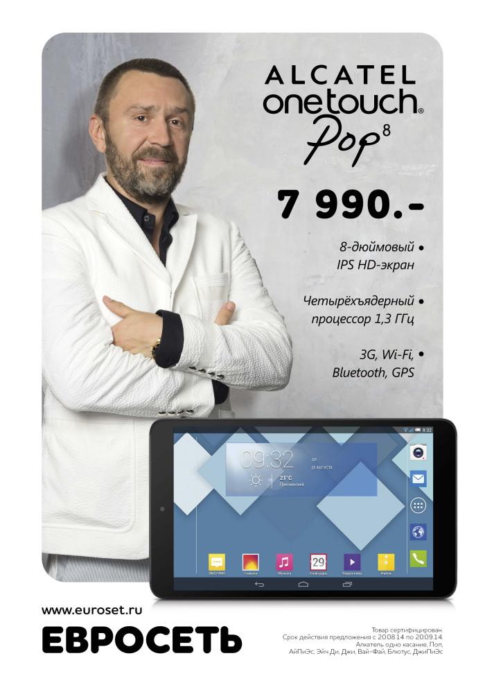 «Евросеть» и ALCATEL ONETOUCH сообщают о старте рекламной кампании планшета ALCATEL ONETOUCH POP8 с участием Сергея Шнурова