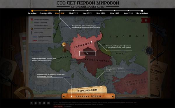 «Сто лет Первой мировой» - это не классический набор статей, а самостоятельный продукт со своей навигацией, логикой и контентом. Спецпроект, доступный по адресу http://ww1.aif.ru/, представляет собой интерактивную карту Европы с обозначением наиболее важных, переломных моментов, встроенными «лонгридами» и инфографикой.