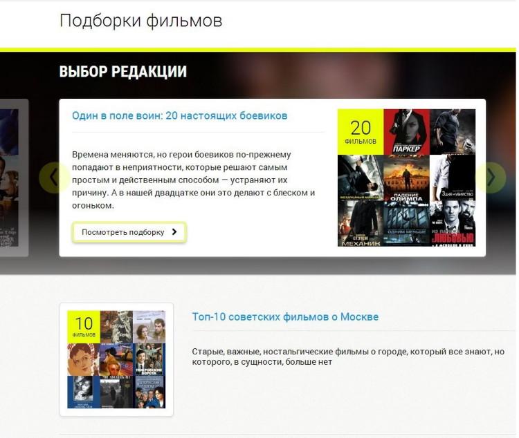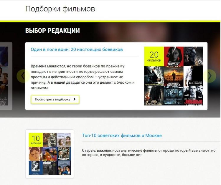 Теперь на главной странице пользователю предлагается выбрать, где он хочет посмотреть кино – дома или в кинотеатре. Если пользователь решает, что дома, он может воспользоваться поиском по фильмам, сериалам и телешоу. При этом ему доступны разные критерии поиска: по жанрам, странам и году выпуска. Также редакцией сайта регулярно составляются тематические подборки фильмов. Если же пользователь хочет посмотреть фильм в кинотеатре, ему предлагается удобный поиск по ближайшим станциям метро, жанрам фильмов и времени сеансов.