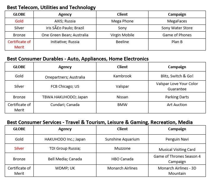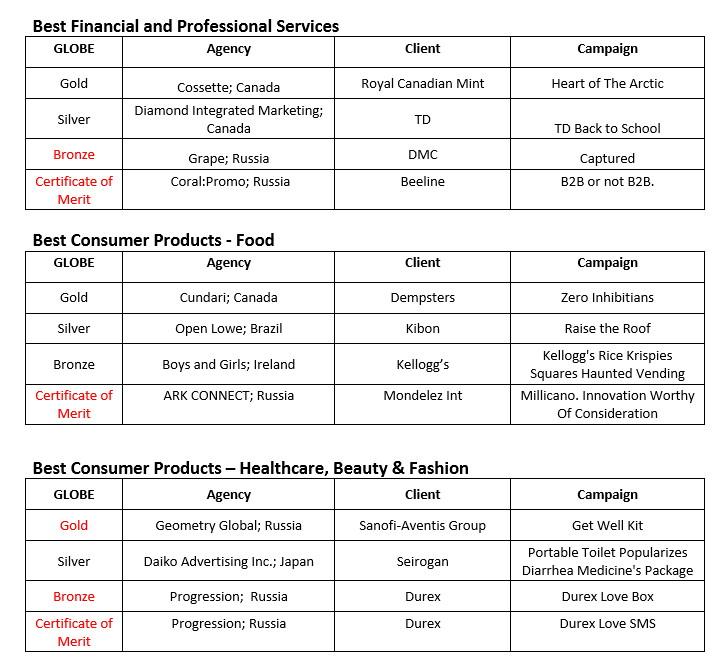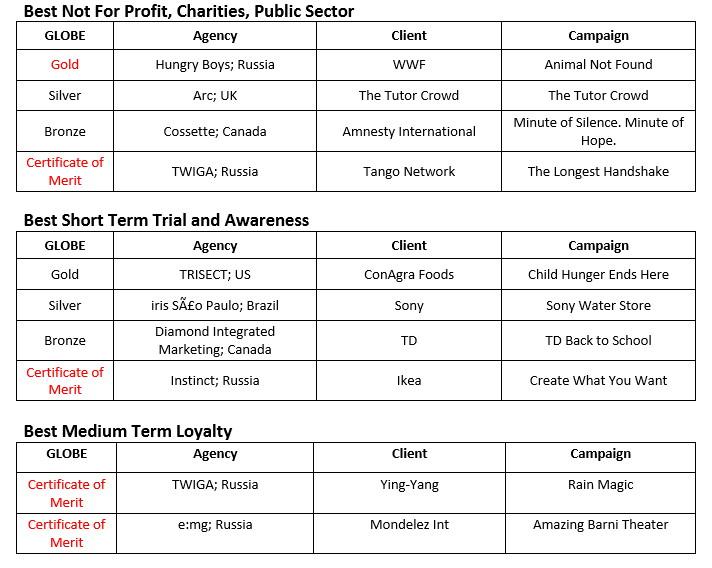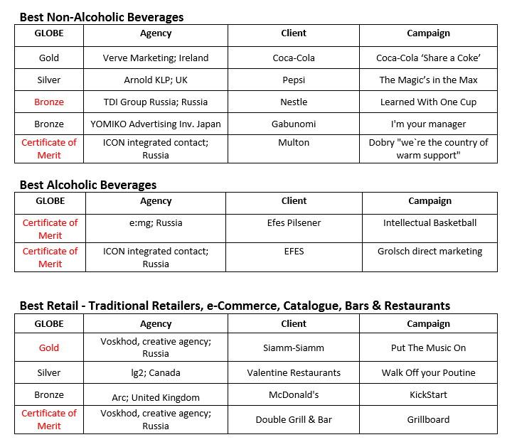 Серебро в категории 'Лучший сервис для потребителей' и золото за лучший директ маркетинг завоевало российское агентство TDI Group за рекламную кампанию 'Музыкальная визитная карточка', организованную для компании Muzzone. Этому же агентству вручили бронзовую награду при оценке рекламы безалкогольных напитков, клиентом на этот раз была компания Nestle.