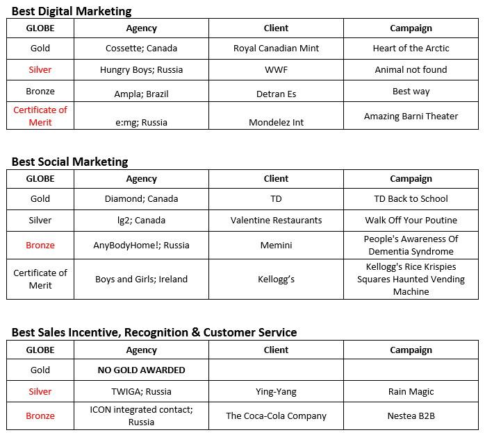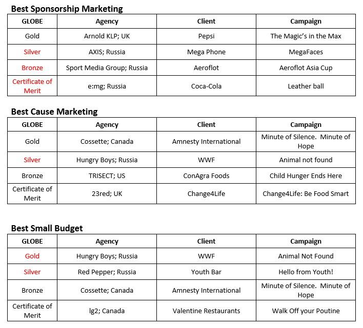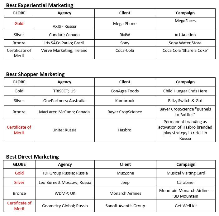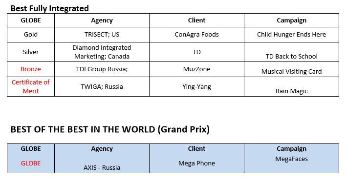 Всего же российские маркетологи получили 49 наград Globes против 19-ти в прошлом году. Среди награжденных – проекты агентств TDI Group Russia, Initiative, ICON, ARK CONNECT, e:mg, Leo Burnett, Coral Promo, Progression, Twiga, Unite, Red Pepper, Sport Media Group, AnyBodyHome! и.т.д.