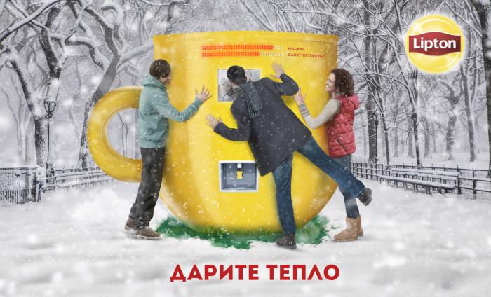 Этой зимой чайный бренд Lipton вместе с креативным агентством Affect создали ростовые интерактивные кружки, благодаря которым москвичи и петербуржцы смогли угостить друг друга горячим чаем. Одна из кружек была установлена в московском парке «Сокольники», другую расположили около входа в петербургский театр «Мюзик-Холл»