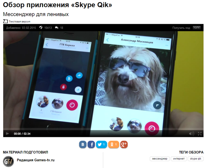 Для того, чтобы ознакомить пользователей с новым приложением, в разделе Hi-tech на Games-tv.ru c интеграцией на официальный канал видеопортала на YouTube, а также мобильные приложения Games-tv.ru и Smart-TV была размещен обзор о Skype QIK. В нем рассказывается о том, для чего было создано приложение, основных преимуществах Skype QIK и правилах использования.