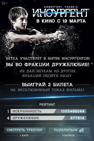 Кроме того, пользователи могут выиграть несколько десятков приглашений на два лица на специальный показ фильма «Инсургент». В розыгрыше участвуют те, кто расшарил пост выигравшей фракции.