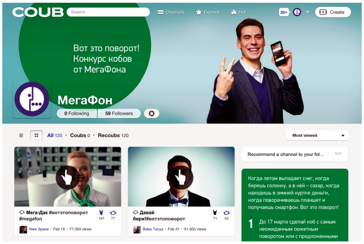Для «МегаФона» на coub.com был создан брендированный канал http://coub.com/megafon.ru. В рамках конкурса пользователям предложили создать кобы с неожиданным сюжетным поворотом. Ролики, отмеченные специальными хештегами и прошедшие модерацию, публиковались на канале. Отдельной номинацией были отмечены работы с использованием официальных рекламных роликов мобильного оператора, в которых снялся популярный российский актер Дмитрий Дюжев.