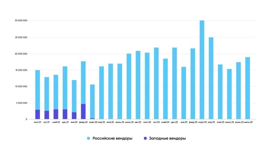 С сентября 2021 до марта 2022 г. доля иностранных вендоров в общем доходесоставляла в среднем до 25% в интеграции Adfox HB, Prebid.js, а также прямымитегами.