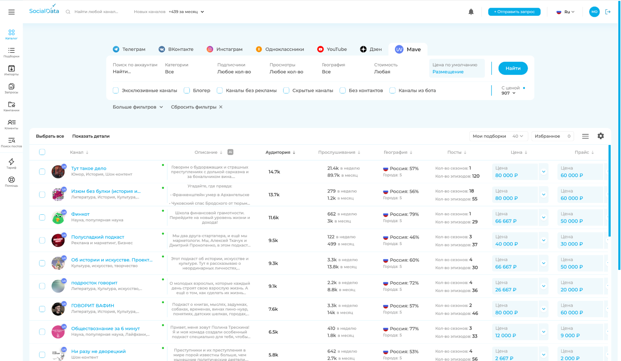 SocialJet и mave оптимизировали процесс запуска рекламы. В январе2024 г. каталог российских подкастов появился на платформе SocialData. Сервиспомогает подобрать подходящий ресурс для рекламной интеграции.