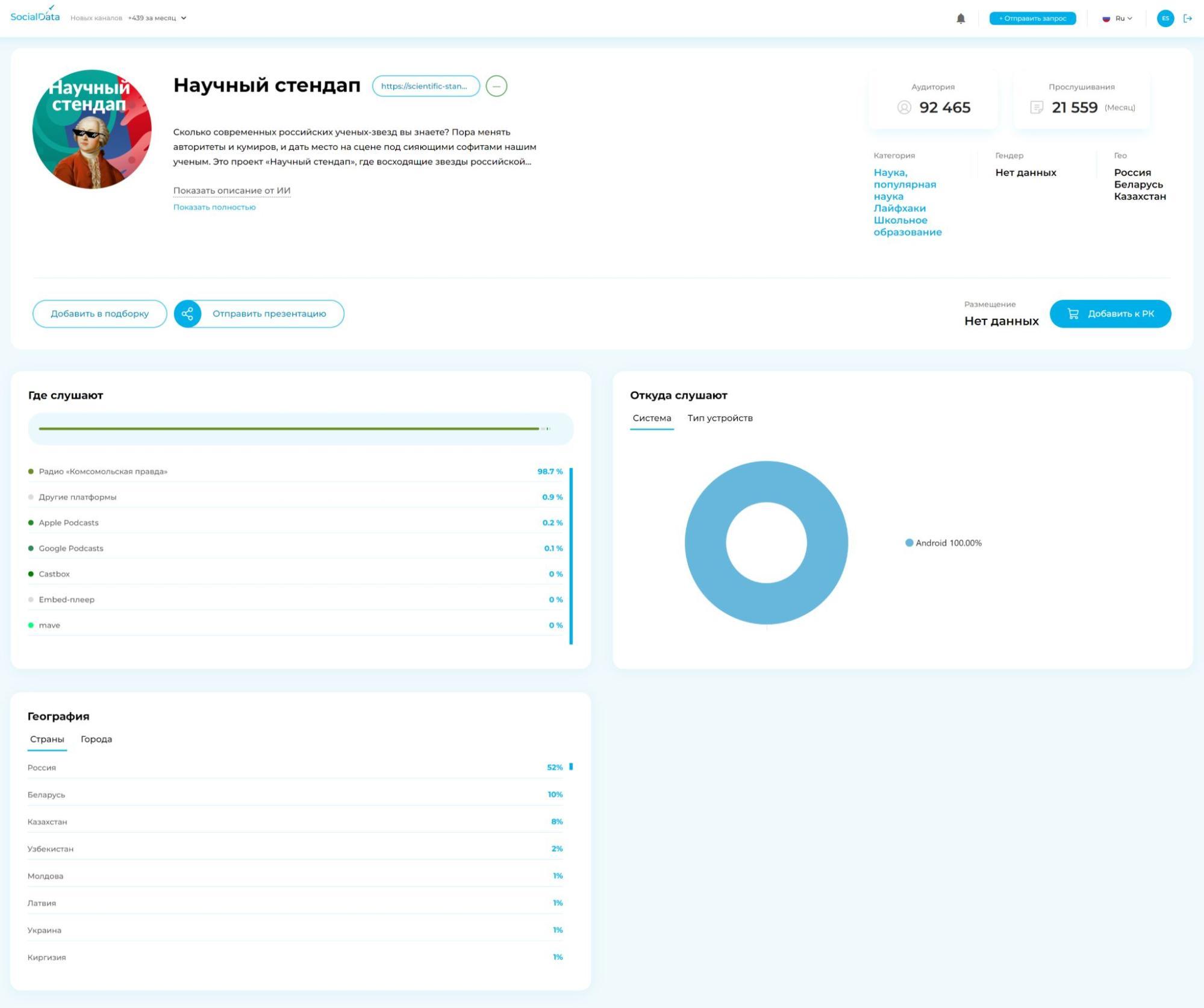 Внутри карточки подкаста размещена детальная статистика,включающая данные по объему прослушиваний, популярности эпизодов, источникампрослушиваний и аудитории.