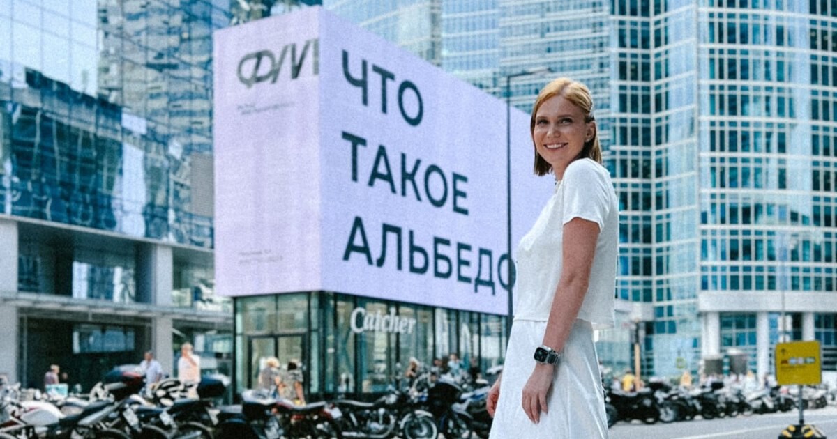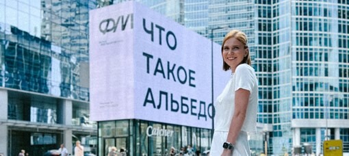 Надпись «Что такое альбедо?» теперь можно встретить на беломбилборде в Москва-сити. Он расположен так, чтобы привлечь внимание зрителя. Всвязи с уменьшением площади важных «белых пятен» из-за таяния льдов иизменения ландшафтов увеличивается общее поглощение энергии, что ведет кглобальному потеплению.