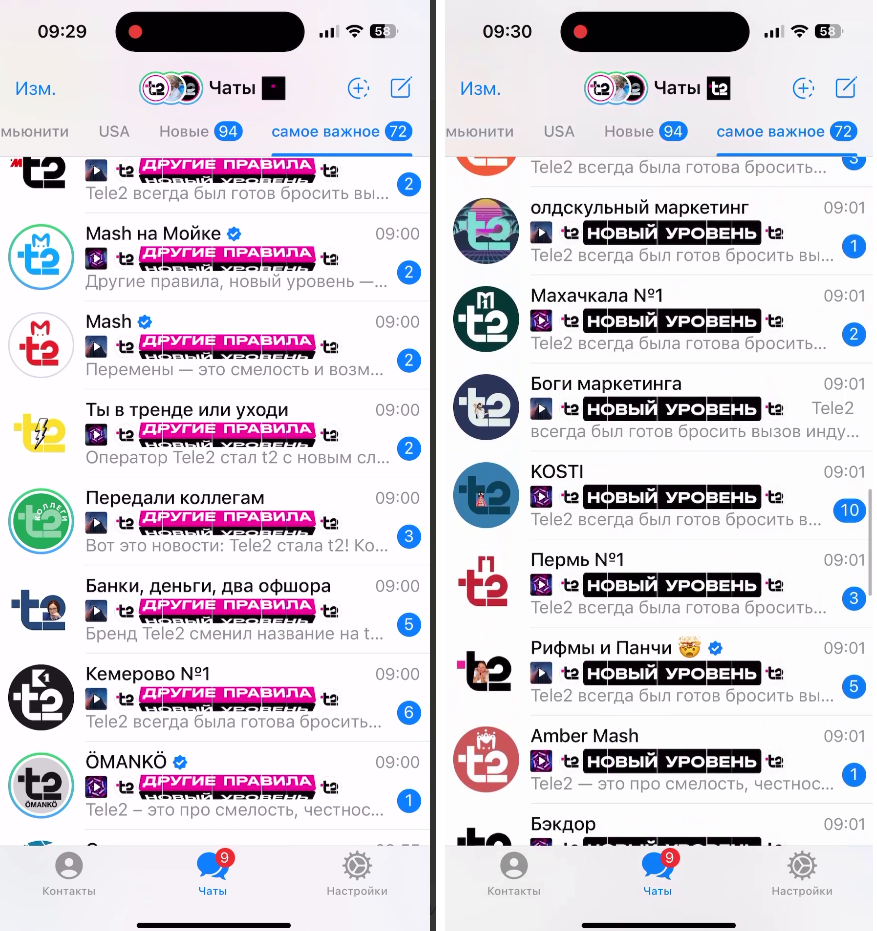 Специалисты заранее отрисовали аватарки с учетом особенностейстилистики канала и нового лого Т2. Флешмоб охватил каналы разнойнаправленности — общественно-политические, маркетинговые и диджитал,развлекательные и лайфстайл, гастрономические и отраслевые медиа. В том числеMash, «Лентач», РБК, «Беспощадный пиарщик», «Антиглянец», AdIndex, MobileReview и многие другие.