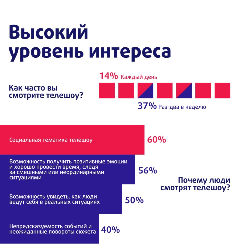 Телешоу смотрят по разным причинам. Для 56% зрителей это «возможностьполучить позитивные эмоции и хорошо провести время, следя за смешными илинеординарными ситуациями». Других привлекает «возможность увидеть, как людиведут себя в реальных ситуациях» (50%), а также «непредсказуемость событий инеожиданные повороты сюжета» (40%). Помимо развлекательного контента аудиторииинтересны острые вопросы. 60% опрошенных выражают интерес к социальной тематикешоу.