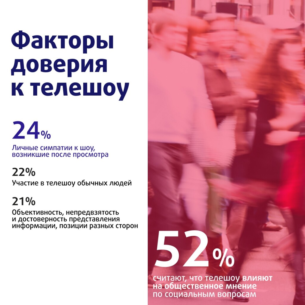 На доверие россиян к телешоу влияет ряд ключевых факторов. Это как личныесимпатии к шоу, возникшие после просмотра (24%), участие в телешоу обычныхлюдей (22%), так и объективность, непредвзятость и достоверность представленияинформации, позиции разных сторон (21%). Не доверяют телешоу только 8%зрителей.