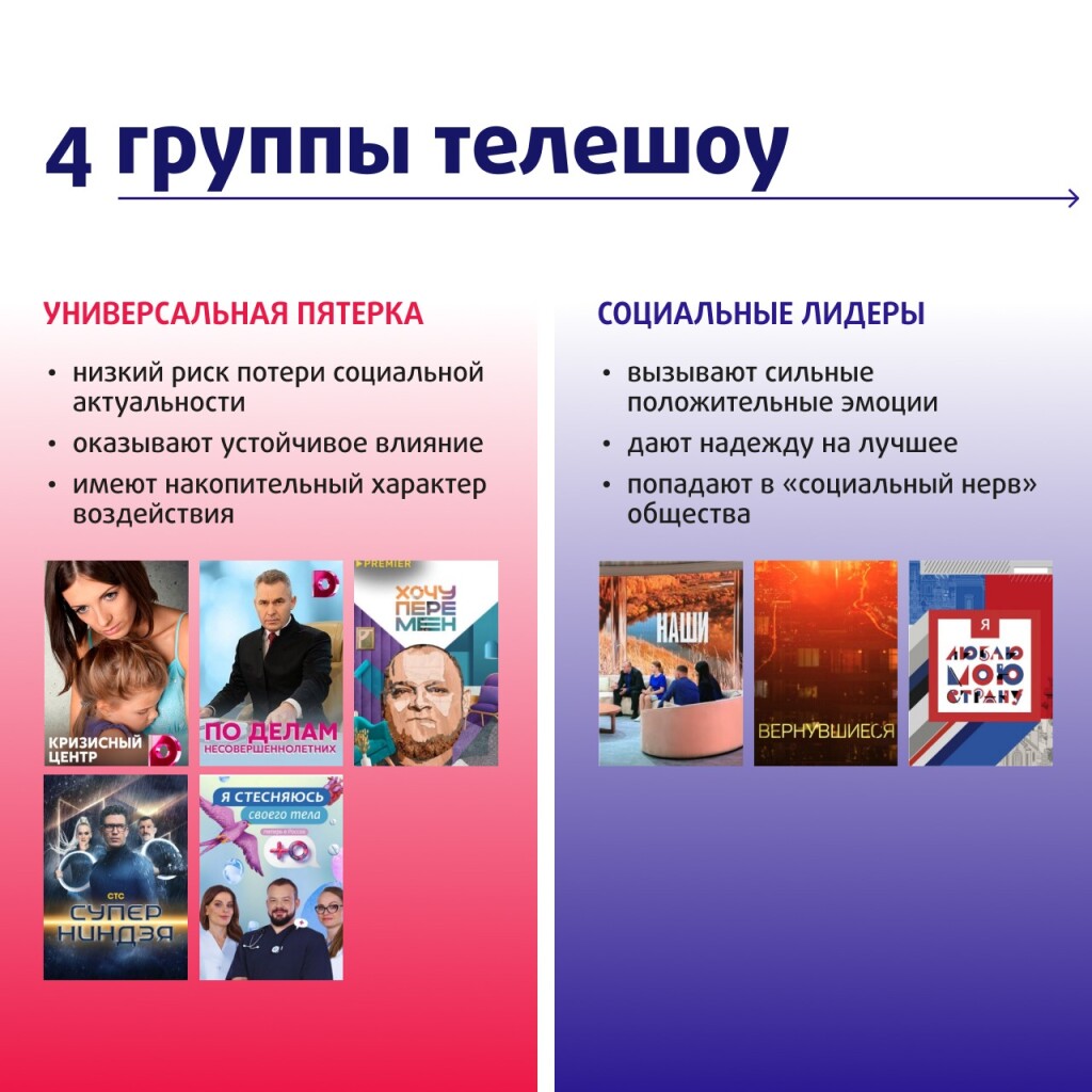 Во второй группе — шоу со средним уровнем влияния и высокой вовлеченностью.Среди них: «Кризисный центр», «По делам несовершеннолетних», «Хочу перемен»,«СуперНиндзя» и «Я стесняюсь своего тела». Это универсальная пятерка, котораяхарактеризуется устойчивым социальным влиянием и накопительным эффектомвоздействия.