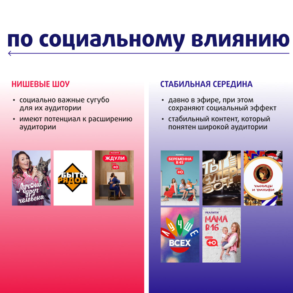 К третьей группе относятся шоу со средним влиянием и вовлеченностью, иначеговоря, «золотая середина», а именно: «Беременна в 45», «Мама в 16», «Ты супер60+», «Умники и Умницы», «Лучше всех». Данные программы давно в эфире, широкоизвестны и понятны аудитории.