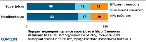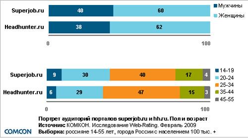 Сравнение портретов аудиторий Superjob.ru и Headhunter.ruЕжемесячная аудитория портала superjob.ru составляет 3,5 млн. пользователей, портала headhunter.ru – 2,6 млн. пользователей (по данным за февраль 2009 г.). По сравнению с ноябрем 2008 г. под влиянием кризиса аудитория Superjob.ru выросла на 30%, Headhunter.ru – на 45%.Пол и возрастДоли мужчин и женщин, посещающих названные веб-ресурсы, практически идентичны. По этому показателю порталы не имеют принципиальных различий.Подавляющее большинство посетителей обоих порталов составляют люди в возрасте 20-34 лет. Применение методов статистического анализа показывает, что для headhunter.ru более характерной является аудитория в возрасте 25-34 лет. Среди посетителей superjob.ru значимо больше людей 14-19 лет и 35-55 лет.