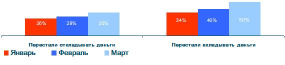 Однако ещё более заметные изменения произошли в структуре расходов россиян. В частности, в марте 2009 года 35% россиян (в феврале 28%) сообщили о том, что из-за текущей экономической ситуации вообще перестали откладывать и копить деньги. А ровно половине всех россиян (50%) пришлось отказаться от любых типов денежных вложений.