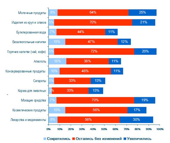 Ассортимент товаров, приобретаемых жителями России, также остаётся неизменным. Процент верных «своим» брендам россиян, которые не собираются переходить на более дешёвые аналоги, колеблется от 35% до 69% по разным категориям товаров. Особенно российские потребители верны ставшим привычными брендам лекарственных препаратов, изделий из круп и злаков, чая и кофе, – 69% россиян не планируют в ближайшее время переходить на более дешёвые аналоги по всем трём категориям товаров.