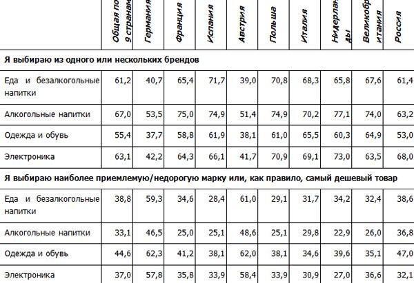 Однако, потребители других европейских стран, принявшие участие в исследовании, оказались более ориентированы на марку товара. Например, бренд является решающим фактором для 70% жителей Испании и Польши когда они покупают еду и безалкогольные напитки. 65% итальянцев и англичан смотрят на бренд, выбирая одежду и обувь. Около 70% покупателей в Нидерландах и Польше ориентируются на бренд при покупке электроники, в России их доля составляет 68%. 61% россиян решают в пользу бренда при покупке продуктов питания и безалкогольных напитков.С другой стороны, все 9 стран, участвовавших в исследовании, отдали предпочтение брендированной продукции при выборе алкогольных напитков. Три четверти французов, испанцев, поляков, англичан и голландцев, а также половина опрошенных немцев и австрийцев, приобретая пиво, вино и другие алкогольные напитки останавливают свой взор на конкретной марке. Также поступают 63% россиян.