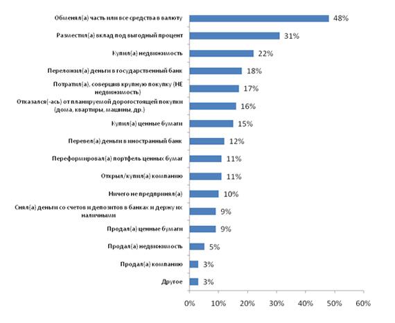 Лишь 10% от всех опрошенных указали, что никаких действий, направленных на сохранение своего состояния, не предприняли. Почти половина участников исследования указала, что перевели средства в иностранную валюту. Еще порядка трети открыли вклады под выгодные проценты. Однако 18% респондентов отметили, что для перестраховки переложили свои деньги в более надежный банк, имеющий поддержку со стороны государства. Из графика видно, что многие из представителей высокодоходной аудитории приобретают ценные бумаги, недвижимость и др., пока цены на них упали. К примеру, 15% купили бумаги, в то время как избавились от них лишь 9% респондентов. Приобрели недвижимость – 22%, продали – лишь 5%.