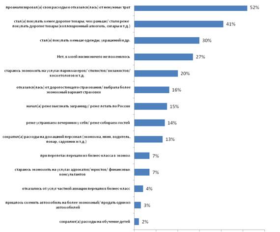 Помимо поиска способов, направленных на сохранение накоплений, обеспеченные слои населения пытаются найти пути, которые позволили бы им сократить текущие расходы. Первое, что сделала половина респондентов – отказалась от ненужных расходов. Еще 41% указали, что пытаются экономить, заменяя некоторые дорогие товары более демократичными аналогами (речь идет о коллекционном алкоголе, сигарах и т.п.). Нельзя не отметить вырисовывающегося контраста: если люди со средним и ниже среднего уровнями дохода экономят, к примеру, на кофе (заменяя натуральный растворимым), то для более высокодоходной категории граждан ограничение затрат за счет продуктов питания не представляется целесообразным. Они видят больше смысла экономить, к примеру, на услугах личных парикмахеров, стилистов, визажистов (20%), на отдыхе (15%) и расходах на домашний персонал (13%) и др. Стоит также отметить, что обеспеченные россияне, впрочем, как и все остальные, не готовы экономить на своих детях.