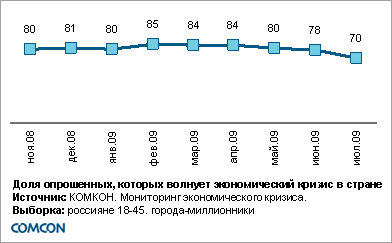 Волнения россиян по поводу текущего экономического кризиса также идут на спад. Несмотря на то, что у подавляющего большинства опрошенных кризис по-прежнему вызывает озабоченность, по сравнению с февралем 2009 г. доля тех, кого волнует экономический кризис, сократилась на 15% и в июле 2009 г. составила 70%.