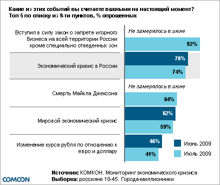 В июле первую позиции самых значимых событий месяца возглавило вступление в силу закона о запрете игорного бизнеса на всей территории России кроме специально отведенных зон. С перевесом в 14% это событие вытеснило на вторую позицию экономический кризис в стране, неизменно лидировавший по важности на протяжении последних нескольких месяцев. Смерть Майкла Джексона не оставила равнодушными 64% опрошенных россиян.