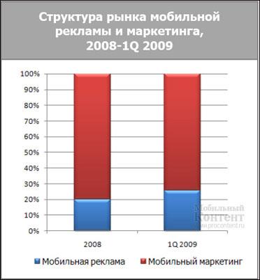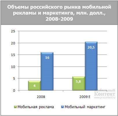 Под мобильной рекламой J’son & Partners Consulting подразумевает маркетинговый канал коммуникации, предназначенный для трансляции рекламного сообщения на мобильный терминал (прямая реклама). Согласно исследованию J'son & Partners Consulting, объем российского рынка мобильной рекламы в 1-м квартале 2009 составил $ 1,39 млн., на конец 2009 года прогнозируется рост на 45% по сравнению с данными 2008 года.