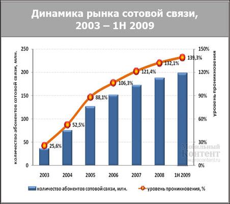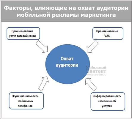 Аудитория мобильной рекламы: Среди факторов, влияющих на охват аудитории, следует отметить: 1) проникновение услуг сотовой связи, по данным компании J’son & Partners Consulting проникновение в 1H 2009 года составило 139,3% (cкорректированные данные по результатам 1-го полугодия 2009 года); 2) проникновение VAS услуг; 3) функциональность мобильных устройств; 4) информированность населения об услугах.