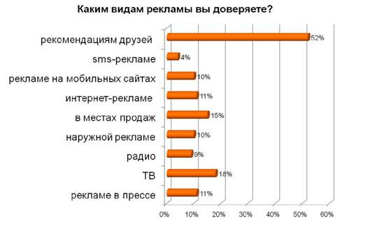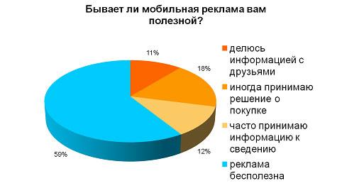 Как показ опрос, SMS-реклама пользуется меньшим доверием. Ей заявили лояльность всего 4% опрошенных. Больше других медиа респонденты доверяют рекламе в местах продаж и телевидению (16% и 18% соответственно). Как и следовало ожидать, более половины участников опроса прислушиваются к рекомендациям друзей и знакомых.Около 40% пользователей периодически переходят по рекламным ссылкам на мобильных сайтах. Получаемой из рекламы информацией делятся с друзьями и знакомыми 11% респондентов, 12% часто принимают эту информацию к сведению, а 18% - иногда покупают рекламируемый товар или услугу. То есть для 41% респондентов мобильная реклама бывает полезной.