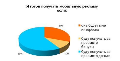 По итогам опроса около трети посетителей мобильных сайтов не возражают против рекламы, если она будет им интересна. Остальные респонденты готовы просматривать рекламу за деньги (например, на счет телефона) или другие бонусы.
