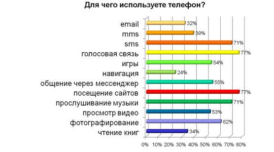 Что же интересно пользователям мобильного интернета? Около 30% участников опроса интересует в мобинете цифровой контент, 35% - новости, а 22% - справочная информация о товарах и услугах. При этом 58% пользователей скачивают в малом вебе софт чаще мелодий, картинок и видео. Лидерами предпочтений респондентов в мобинете стали общение (79%), развлекательная информация (51%) и электронная почта (48%). Любопытно также, что по 77% респондентов используют телефон для голосовой связи и посещения мобильных сайтов. Активно посылают SMS 71% пользователей, около 70% - также прослушивают музыку через телефон. Фотографируют с помощью трубки 62% опрошенных, 54% - играют в телефонные игры, а 55% - общаются через установлены в телефоне приложения-мессенджеры. Пользуются навигацией всего 24%, MMS - 39%, читают электронные книги – 34% участников опроса.