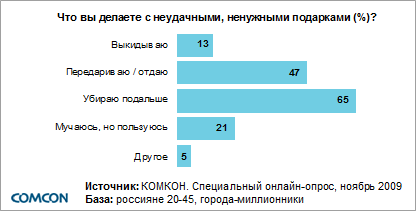 В списке самых ужасных из когда-либо полученных подарков лидируют мелочи для дома (55%), одежда/обувь (34%), косметика/парфюмерия (31%), оригинальные сувениры (25%) и канцтовары (19%). Ненужные и неудачные подарки чаще всего выбрасываются (13%), передариваются (47%) или убираются подальше (65%).