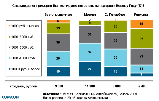В канун Нового года 95% россиян планируют покупать подарки для родных и близких. Средние затраты на подарки и сувениры, приобретаемые для своего окружения одним человеком, составляют 11 900 руб. для москвичей, 5400 руб. для петербуржцев и 6 700 руб. для жителей регионов.