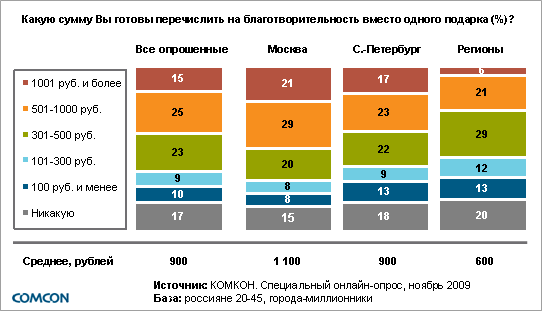 Половина опрошенных готовы отказаться от получения новогодних сувениров в пользу благотворительности, таковы результаты специального опроса, проведенного компанией КОМКОН в рамках инициативы Благотворительность вместо сувениров, призывающей отказаться от покупки бесполезных сувениров в пользу помощи нуждающимся. Опрос проводился в ноябре 2009 г. в городах-миллионниках среди россиян в возрасте 20-45 лет.