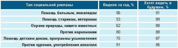 Самой заметной оказалась реклама против курения и употребления алкоголя (91%), против наркомании (80%), в поддержку детских домов и программ усыновления (75%), за безопасность дорожного движения (74%) и информирование об опасных заболеваниях (74%).