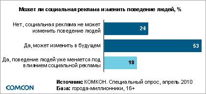 Четверть опрошенных продемонстрировали скептицизм в отношении способности социальной рекламы изменить поведение людей, в то время как более половины респондентов выразили уверенность в том, что в будущем реклама может изменить ситуацию, и еще 18% опрошенных заметили, что поведение окружающих уже меняется под влиянием социальной рекламы.