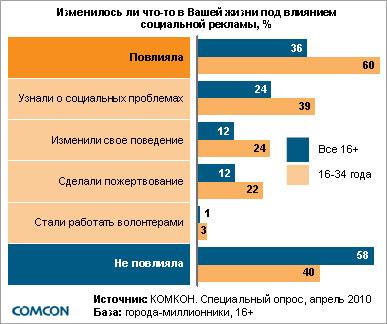 Действие социальной рекламы на себе уже ощутили 36% опрошенных, причем стоит отметить, что влиянию этого вида коммуникаций более подвержена молодая аудитория в возрасте до 35 лет – здесь эффект от социальной рекламы на себе ощутили 68% опрошенных. В частности, 40% молодых людей обратили внимание на какие-либо социальные проблемы, изменили свое поведение (12%) или сделали пожертвование (12%). Три процента опрошенных стали волонтерами.