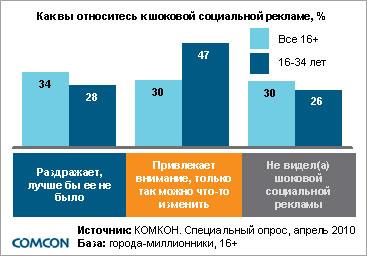 На вопрос, приятнее ли читать журнал, газету, смотреть телепередачи, если в них присутствует социальная реклама, 54% опрошенных ответили утвердительно, однозначное «нет» ответили 18% респондентов, 22% опрошенных продемонстрировали безразличие в этом вопросе. Что касается отношения к шоковой рекламе, результаты исследования не выявили единого мнения среди респондентов. Число тех, кого реклама раздражает, привлекает или тех, кто не обратил на нее внимания, распределилось примерно поровну. В возрастной группе до 35 лет доля тех, кого привлекает шоковая социальная реклама, оказалась существенно выше (47%). Это означает, что коммуникация такого рода активнее воздействует на молодежь.