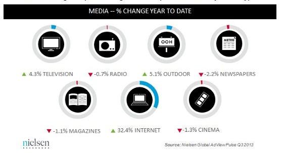 Рост дисплейной интернет-рекламы во всем мире за первые три квартала 2013 года составил 32% (в сравнении с аналогичным периодом 2012 года). Об этом говорится в квартальном отчете Global Adview Pulse от Nielsen