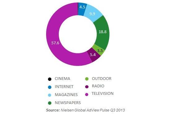 Телевидению же было отдано 57,6% от всех рекламных затрат в мире, хотя в разных регионах и цифры были разными.