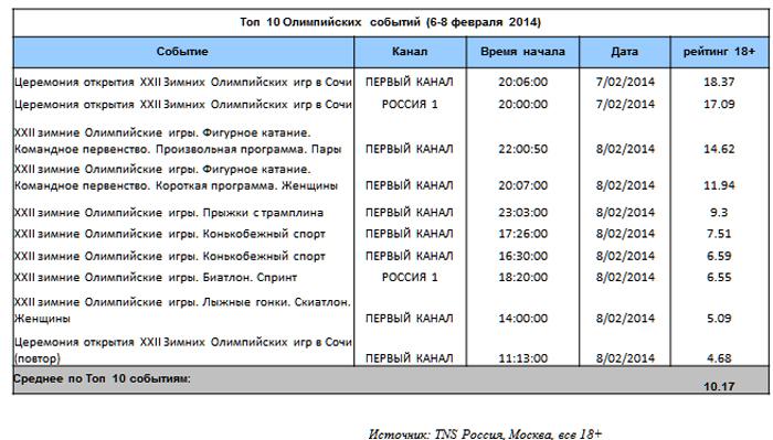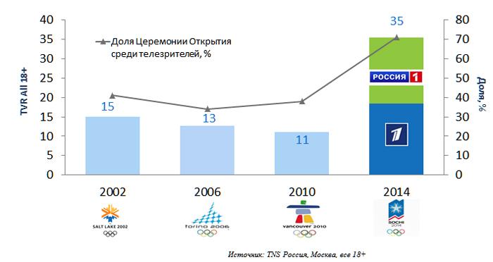 - Церемония открытия набрала по Москве TVR 35%. Доля каналов, транслирующих Олимпиаду, составила 70% телезрителей.