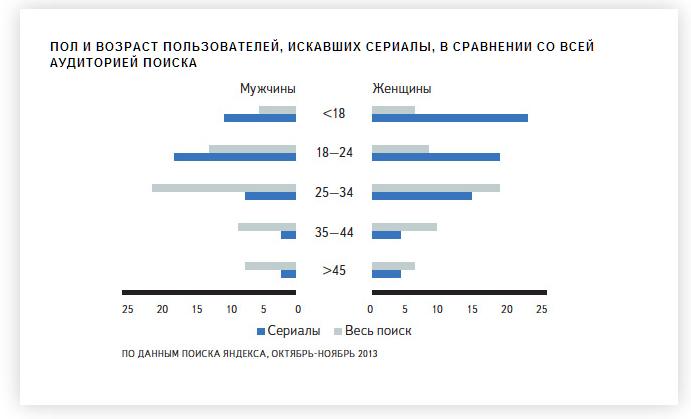 Аудитория сериалов не похожа на аудиторию поиска в целом. Две трети пользователей, искавших сериалы — это молодёжь до 25 лет, хотя в аудитории поиска их меньше трети. Женщин, которые интересуются сериалами, в полтора раза больше, чем мужчин, в то время как в поиске их поровну.
