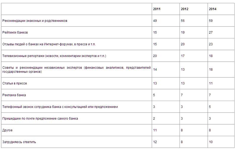 Уровень доверия официальным источникам остается на невысоком уровне: телевизионным репортажам доверяют 18% респондентов, статьям в печатной прессе - 11%, банковской рекламе - 7%. Наименьшего доверия, по мнению россиян, по-прежнему заслуживают индивидуальные предложения от банка - телефонные звонки или письма от кредитно-финансовых организаций, как источники информации о банке, воспринимает всерьез не более 5% опрошенных.