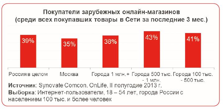 62% посетителей совершали покупки, при этом покупательская активность москвичей также оказалась выше средней по России (69%). Среди онлайн-шопперов 39% совершали покупки в зарубежных онлайн-магазинах. Доля покупателей в небольших городах даже немного превысила столичный показатель и составила 41%.