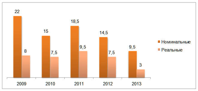 Диаграмма 1. Номинальные и реальные темпы роста повседневного потребления в России в 2009 – 2013 гг. (%)