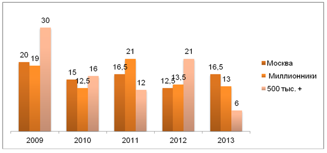 В отличие от ситуации 2001-2008 гг., когда экономический рост и рост потребления носили «фронтальный» характер (росло всё и все и примерно одинаковыми темпами - по 25-30% в год в номинальном выражении), рост потребления в посткризисную пятилетку 2009-2013 гг. приобрел дифференцированный характер. В частности, различия мы видим и по типам городов, и по отдельным социальным и доходным группам потребителей.